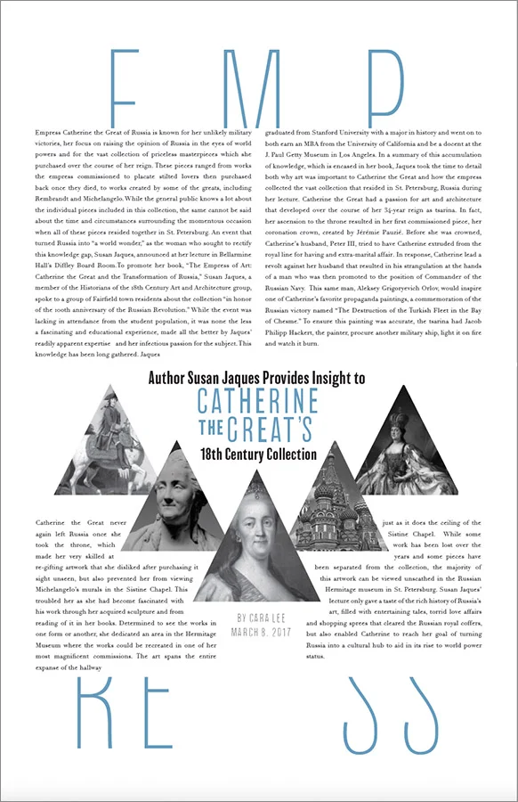 This project entailed attending an event about Catherine the Great at Fairfield University. After attending, the students were tasked with creating an introduction page to the entertainment section (The Vine) of the university newspaper that dealt with the event. Once this was completed, they were to design the layout of the article based on what the reporter wrote.