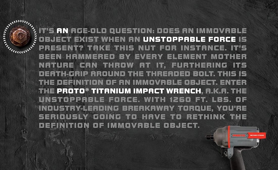 The concept was built around the fact that these tools have the highest amount of breakaway torque on the market today. It played off of the question of what happens when an unstoppable force meets an immovable object. In this instance, the PROTO Air Tool answers that very question.